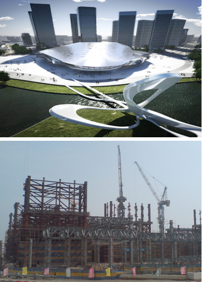 大連國際會議中心 由中建八局大連分公司承建采用中昇建機 二臺ZSL750行走式動臂塔機最大吊重15m處吊50t