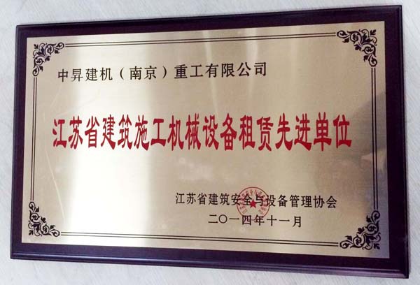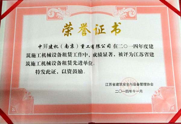 2014年11月中昇建機(jī)(南京)重工有限公司因優(yōu)秀的設(shè)備管理水平被江蘇省建筑安全與設(shè)備管理協(xié)會(huì)評(píng)為“江蘇省建筑施工機(jī)械設(shè)備租賃先進(jìn)單位”榮譽(yù)稱(chēng)號(hào),并頒發(fā)了證書(shū)和獎(jiǎng)?wù)隆?