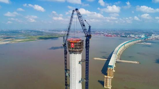 9月28日上午11:28,隨著最后一方混凝土澆筑完畢,由中鐵大橋局負責施工、中昇建機提供大型塔吊的世界最高公鐵橋主塔——滬通長江大橋北側(cè)28號主塔成功封頂,標志著滬通長江大橋工程取得關(guān)鍵進展。