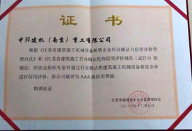 中昇建機被江蘇省建筑安全與設(shè)備管理協(xié)會評為2013度“AAA級信用等級企業(yè)”