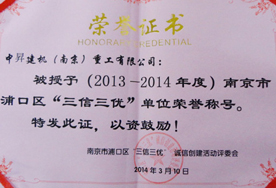 中昇建機被授予2013—2014年度南京市浦口區(qū)“三信三優(yōu)” 單位榮譽稱號