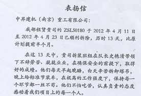 我公司在中建八局金陵飯店擴(kuò)建工程項(xiàng)目結(jié)束之際,以認(rèn)真負(fù)責(zé)的態(tài)度、高水平的施工質(zhì)量,圓滿完成塔機(jī)拆除工作,榮獲項(xiàng)目方的高度表?yè)P(yáng)。 2012-06-26 |