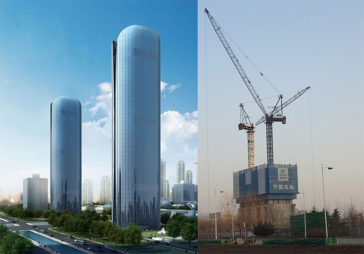建筑高度380米,采用中昇建機(jī)ZSL3200(100T)及ZSL750(50T)各一臺(tái)。