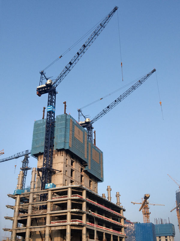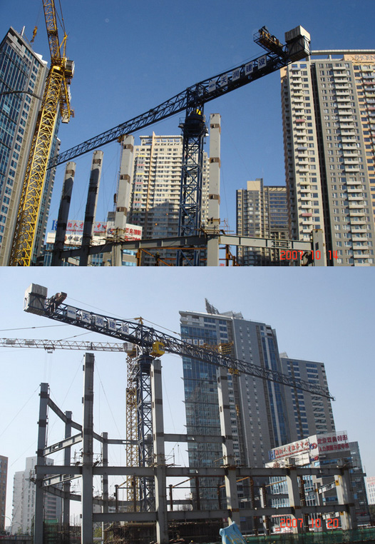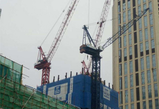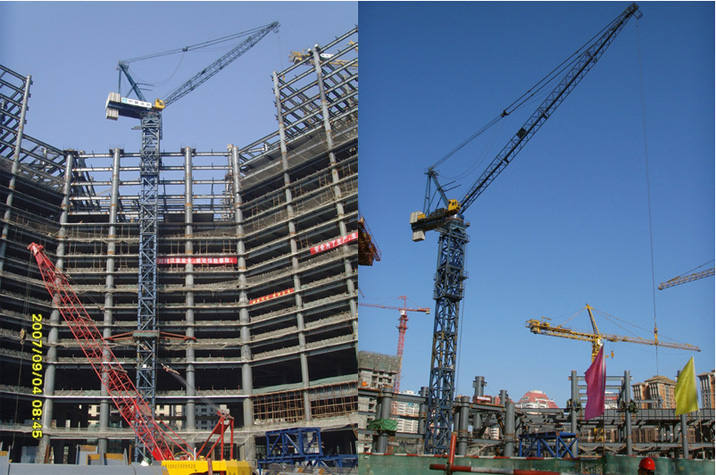 施工高度一棟200米、一棟180米,采用中昇建機(jī)ZSL850(50t)一臺(tái)、ZSL750(50t)一臺(tái)。